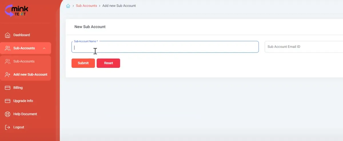 Enter the Sub-Account Name and Email ID.