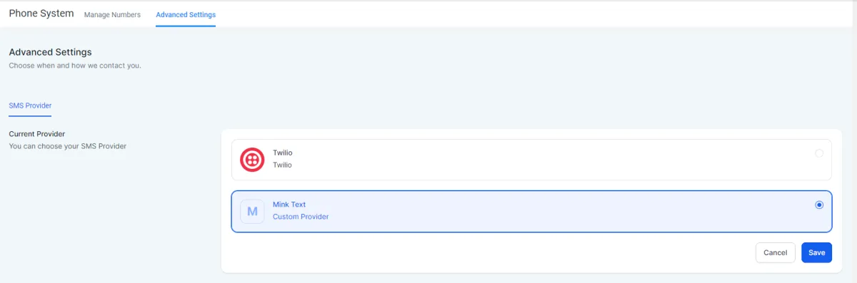 Then click Phone Numbers and click Advanced Settings, after that click Mink Text and hit Save to finalize the integration.